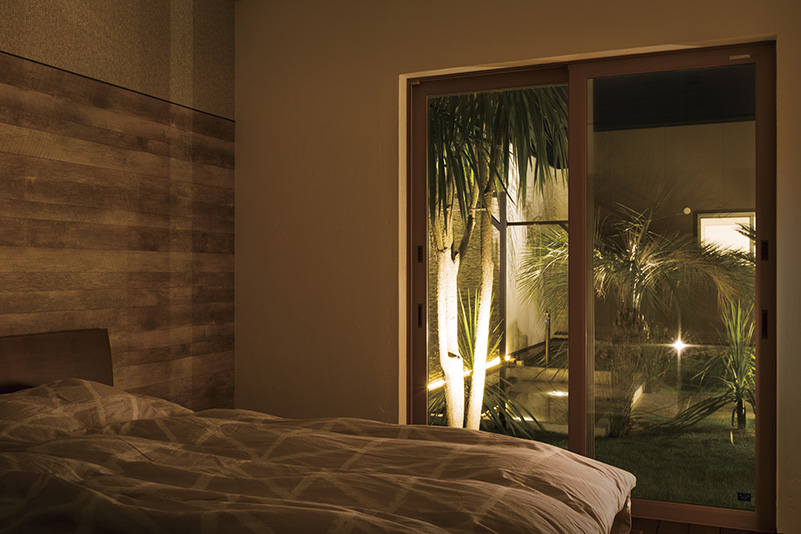 夜間、樹木や外壁を間接照明でライトアップすることで、お家の雰囲気がよりラグジュアリーになります。夜、帰宅したときにライトアップされた我が家を見て「帰って来たんだ」というホッとした気持ちも味わうことができます。