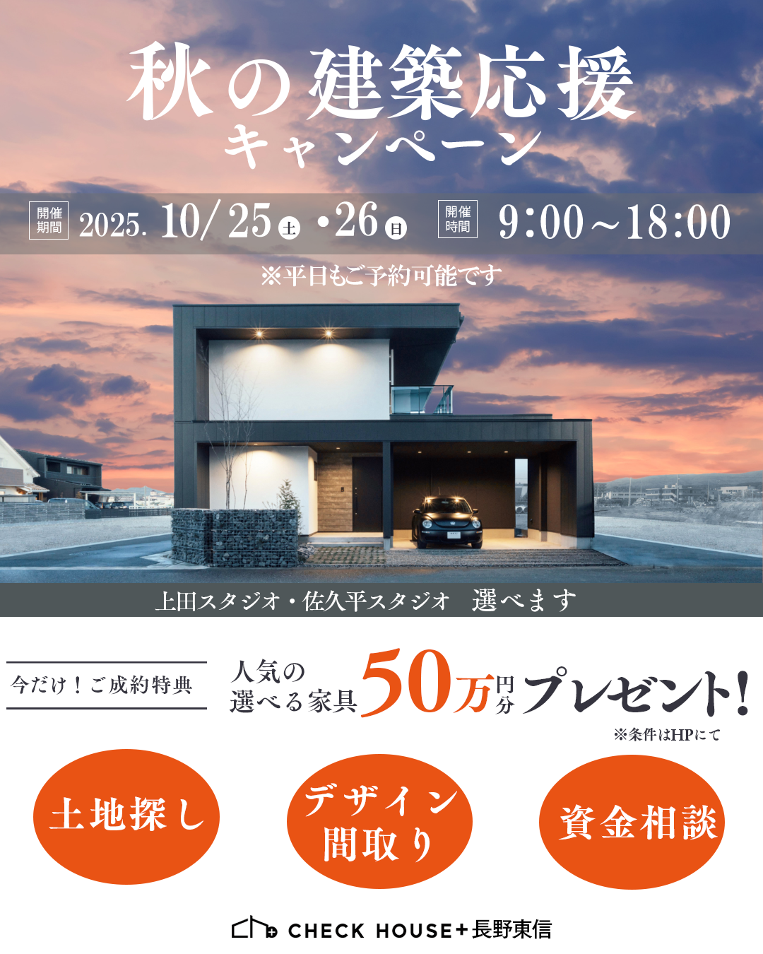 チェックハウスプラス長野東信で新築住宅をご成約、完成後1か月間モデルハウスとして公開にご協力いただける方に、WEBカタログより家具50万円(税込)相当をお選びいただけます。
